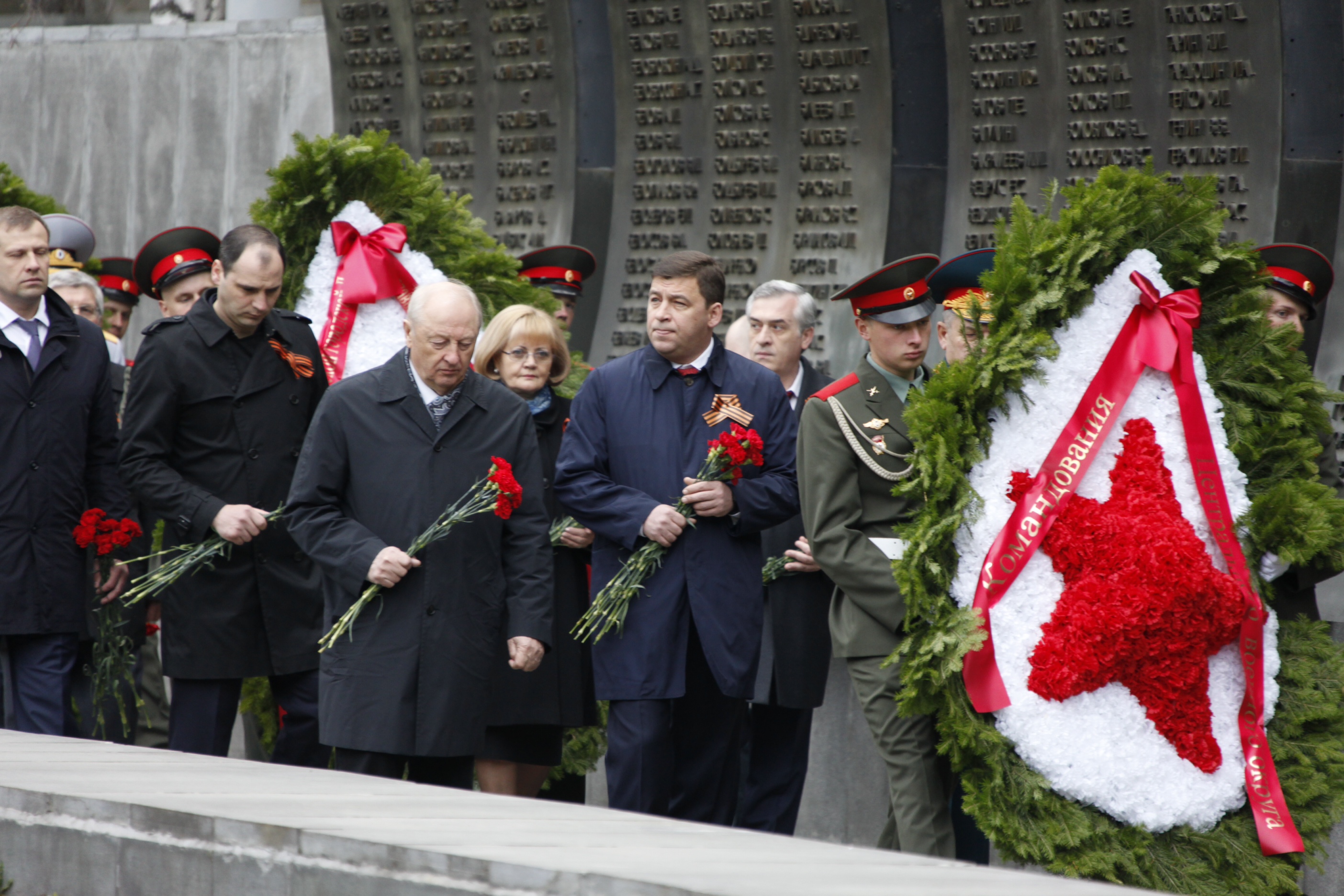 Еще до начала парада они приняли участие в торжественно-траурной церемонии "Память", возложив венки к братской могиле Широкореченского мемориала, где захоронены воины Великой Отечественной, умершие в Свердловских госпиталях.