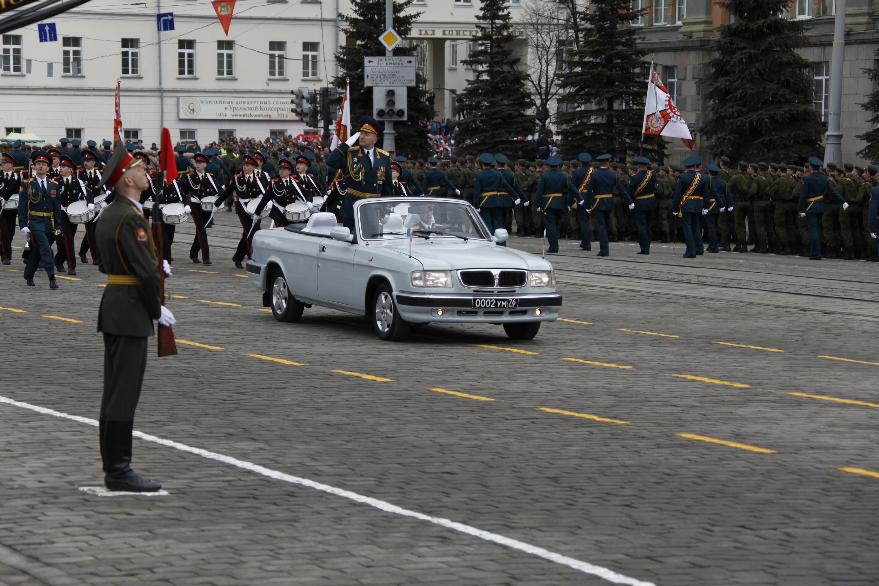 По проспекту Ленина и площади 1905 года прошли бойцы различных видов войск Вооруженных сил РФ, бойцы внутренних войск МВД России, войск МЧС РФ, курсанты военных учебных заведений. По брусчатке главной площади города, рыча двигателями, проехали танки Т-72, боевые машины пехоты БМП-2, бронетранспортеры БТР-80, самоходные артиллерийские установки "МСТА-С", пусковые установки "Точка-У" и другие виды военной техники.