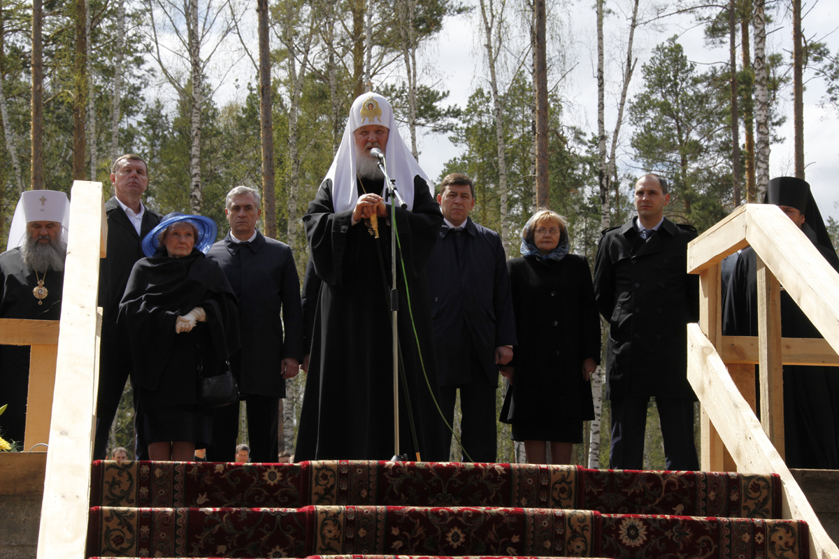 Свой визит на Средний Урал Святейший Патриарх Кирилл начал с посещения монастыря святых Царственных Страстотерпцев в урочище Ганина Яма. Сюда он приехал в сопровождении губернатора Евгения Куйвашева,митрополита Екатеринбургского Кирилла, председателя благотворительного фонда им. Великой княгини Ольги Александровны Марии Романовой, княгини Ольги Куликовской-Романовой и генерального директора УГМК Андрея Козицына.