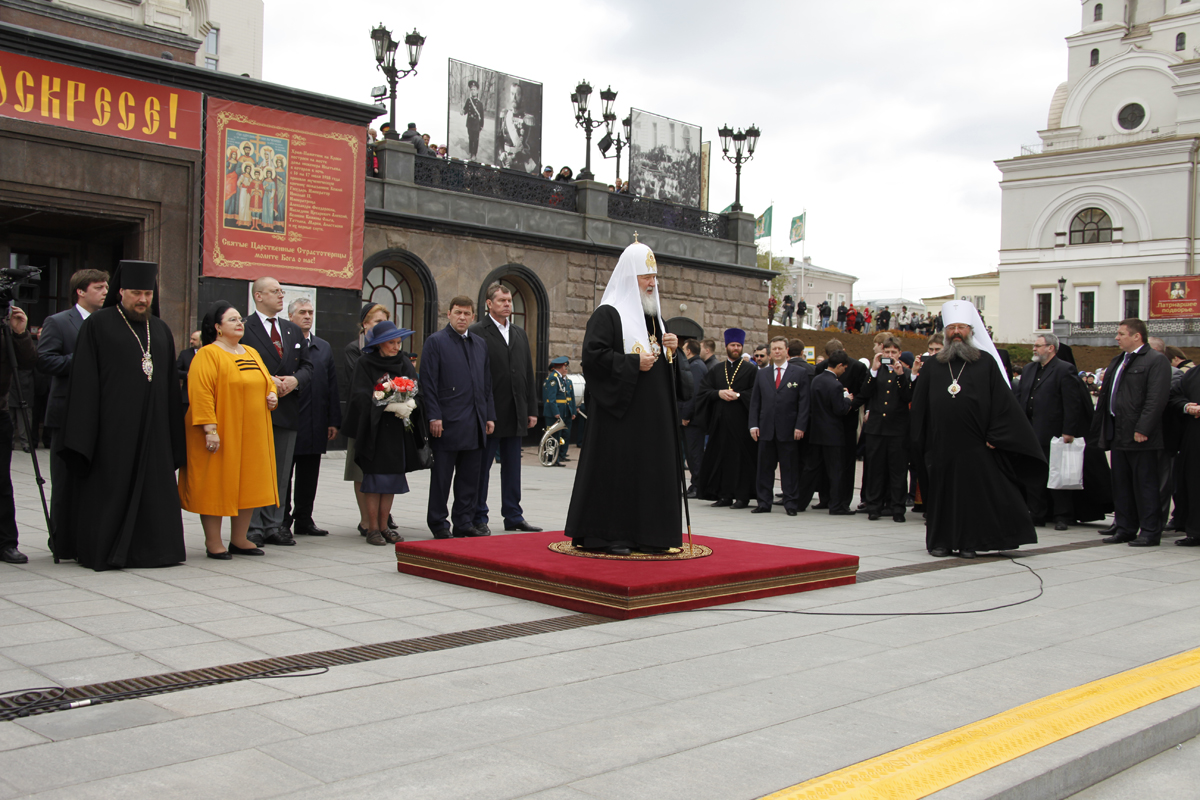 Патриарх посетил "Царский" храм, где ему подарили образ Николая II от паломников и прихожан обители. Глава РПЦ отслужил литию — молебен под открытым небом возле поклонного креста, установленного на месте обнаружения останков царской семьи. Патриарх Кирилл освятил основание храма в честь Державной иконы Божией Матери и обратился к верующим — на Ганиной Яме собралось несколько тысяч прихожан.