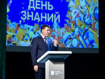 На сцене актового зала главу региона встретили сёстры-первоклассницы Амеллия, Камелия и Жасмин Закиевы и предложили оставить первую запись в книге почётных гостей. Евгений Куйвашев оставил пожелания учащимся, которые впервые сели за парты этого учебного заведения.