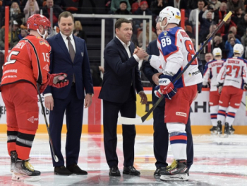 Евгений Куйвашев и Владислав Третьяк приняли участие в церемонии вбрасывания шайбы перед началом матча "Автомобилист" – ЦСКА.
