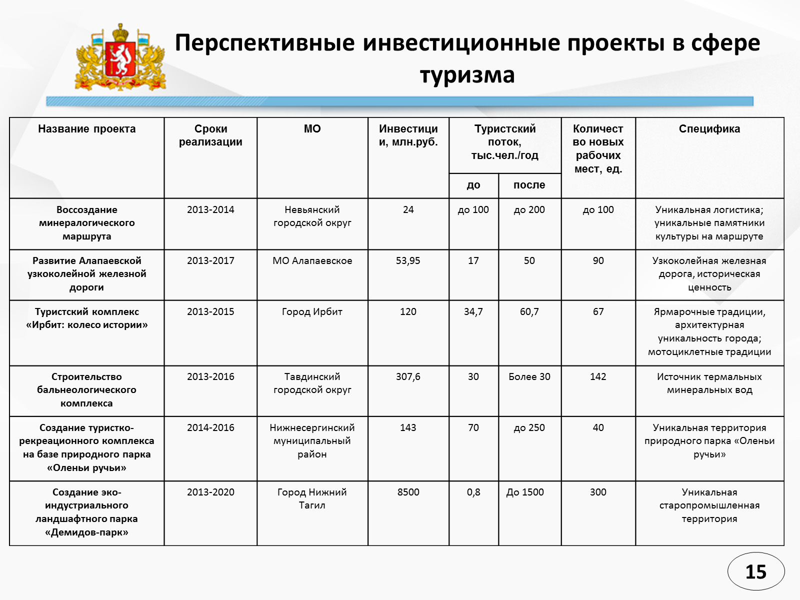 Наиболее масштабный из инвестиционных проектов – своеобразный памятник индустриальному наследию Урала под открытым небом "Демидов-парк". Реализация этого проекта позволит привлечь на старопромышленную территорию до полутора миллионов туристов в год, создать около 300 новых рабочих мест.
