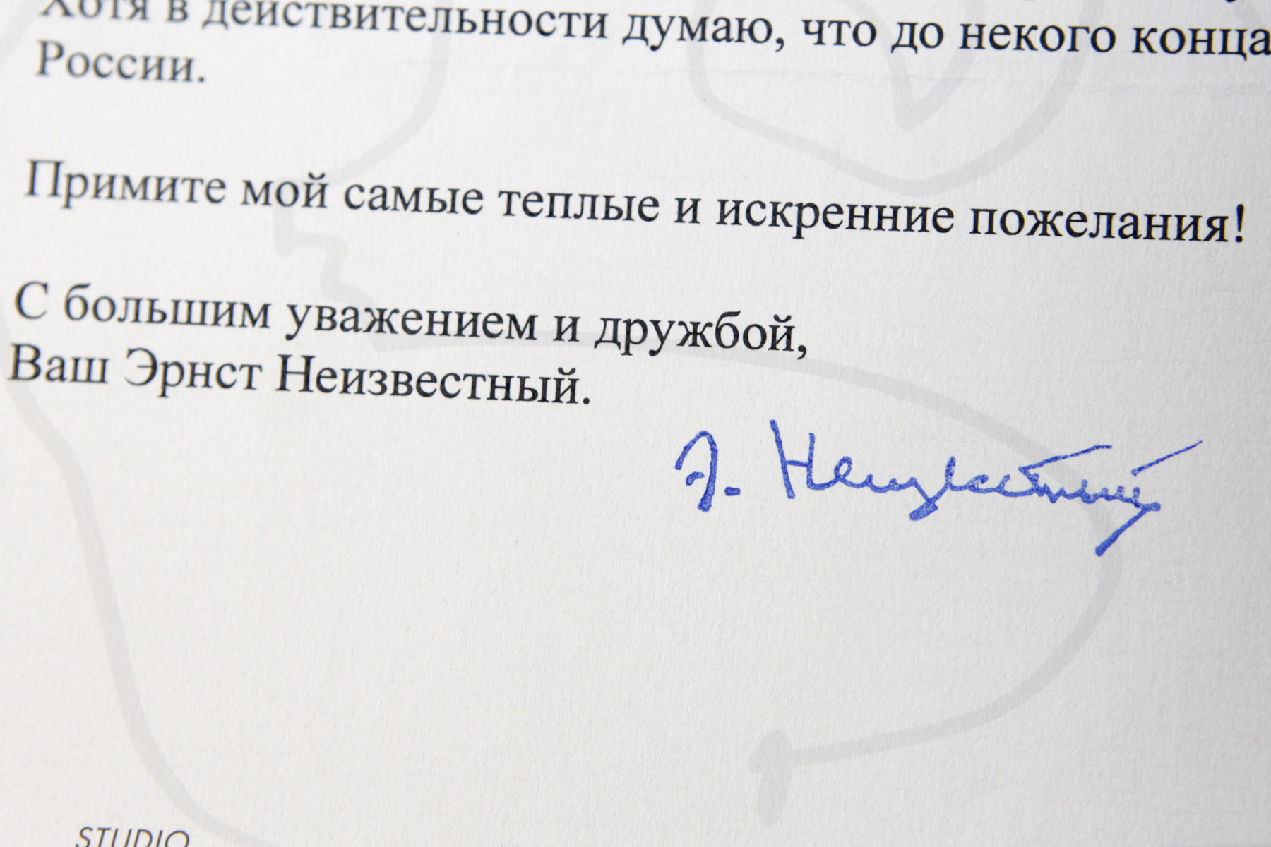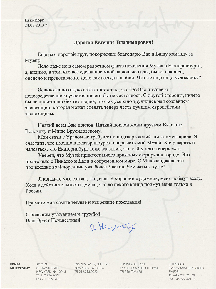 "Еще раз, дорогой друг, покорнейше благодарю Вас и Вашу команду за Музей! Дело даже не в самом радостном факте появления музея в Екатеринбурге, а, видимо, в том, что все сделанное мной за долгие годы, было, наконец, оценено и представлено. Дело как всегда в любви. Что же еще надо художнику, — замечает в письме, адресованном губернатору Эрнст Неизвестный. — Великолепно отдаю себе отчет в том, что без Вас и Вашего непосредственного участия ничего бы не состоялось".