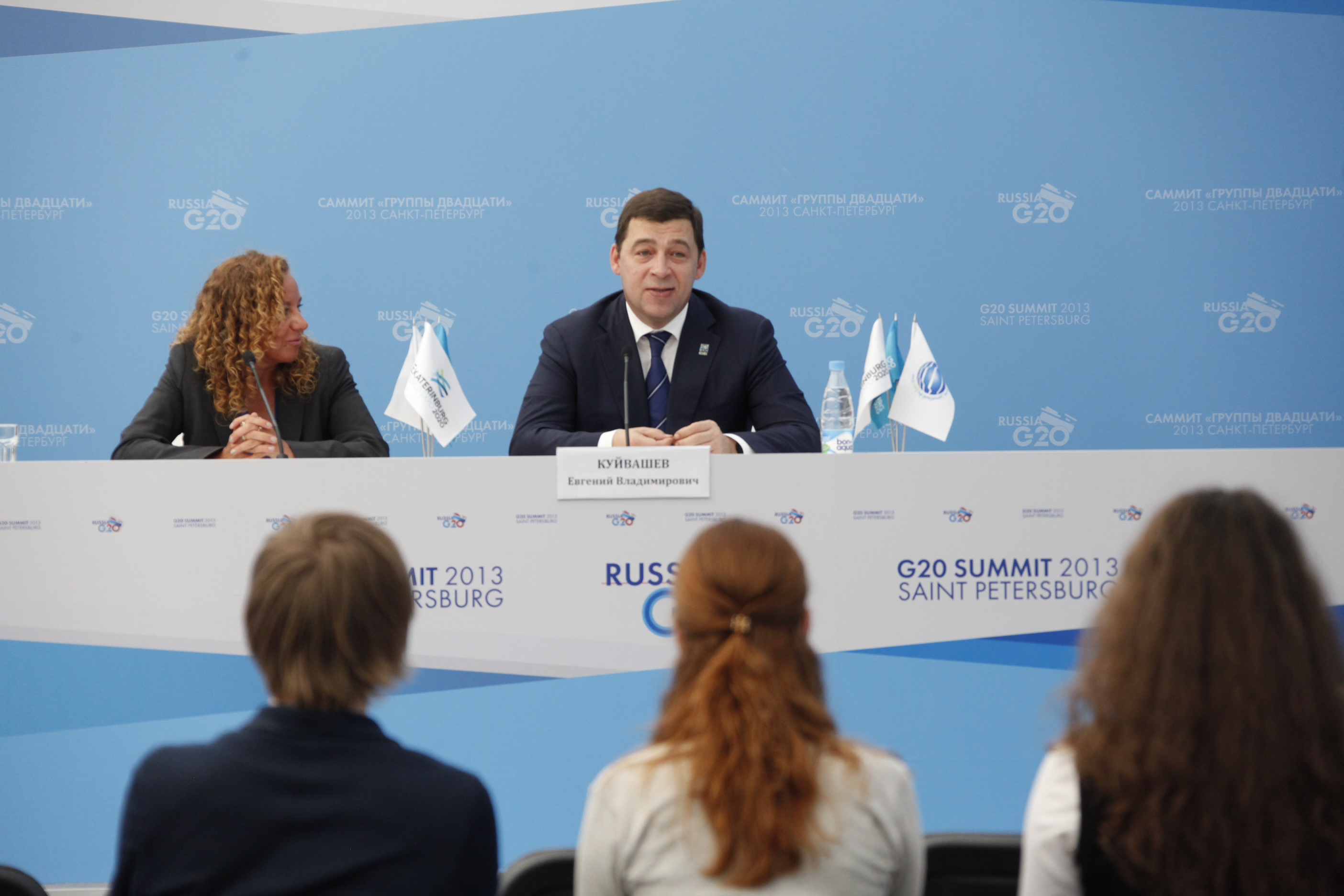 Евгений Куйвашев в рамках саммита G20 в Санкт-Петербурге представил Екатеринбург и заявку России на проведение в 2020 году Всемирной универсальной выставки ЭКСПО журналистам.
