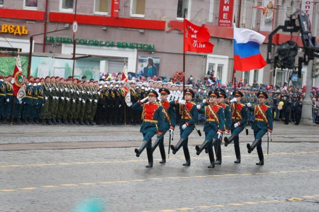 Строем прошли роты военнослужащих в исторической форме образца Великой отечественной войны, роты сухопутных войск, ВВС и ВМФ, бойцы екатеринбургского гарнизона, представители мотострелковой бригады, десантники, представители правоохранительных органов и структур, курсанты института МЧС, в том числе девушки, курсанты других военных учебных заведений.