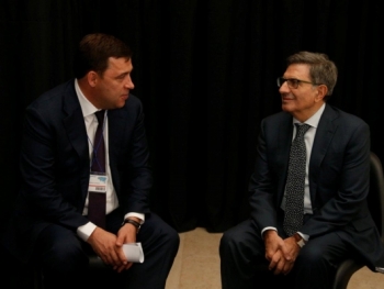 Губернатор Евгений Куйвашев в рамках рабочего визита в Италию, где он принял участие в IV Евразийском форуме, провел встречу с председателем совета директоров "Банка Интеза" Антонио Фаллико.