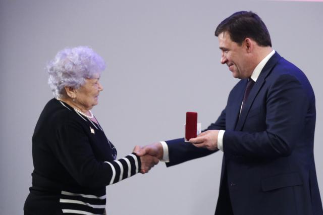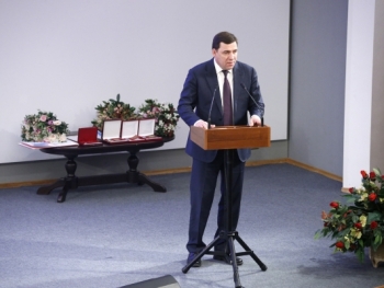 На торжественном собрании губернатор по многолетней традиции вручил государственные награды и знаки отличия Свердловской области.