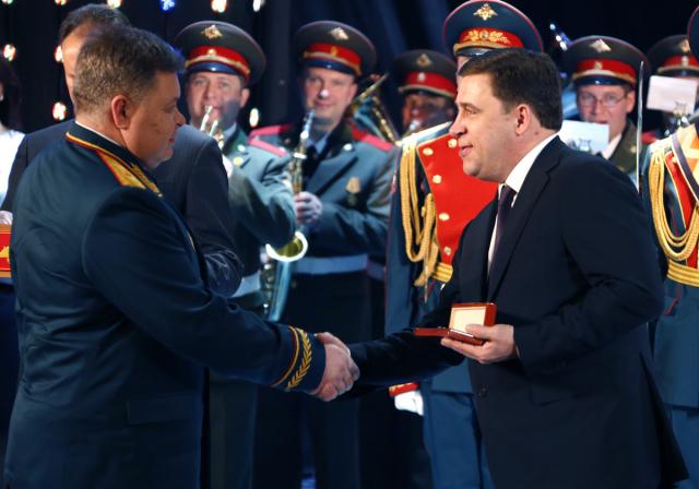 Командующий войсками ЦВО Владимир Зарудницкий вручил губернатору Евгению Куйвашеву медаль "За укрепление боевого содружества"