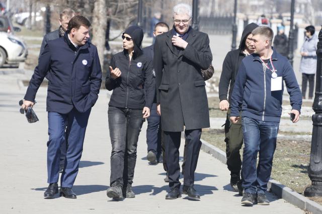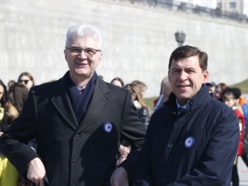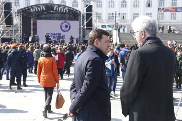 Губернатор Свердловской области Евгений Куйвашев и глава администрации Екатеринбурга Александр Якоб вместе с тысячами свердловчан 12 апреля приняли участие в праздновании Дня космонавтики в Историческом сквере уральской столицы.