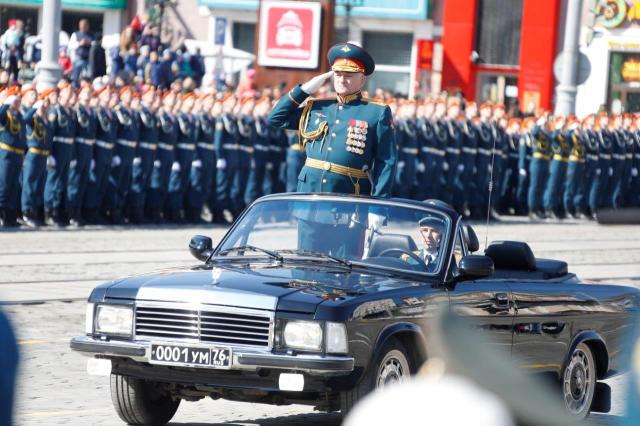 Командовал парадом заместитель командующего войсками Центрального военного округа генерал-лейтенант Хасан Калоев. Принял парад командующий войсками ЦВО генерал-полковник Владимир Зарудницкий. Он также с трибуны поздравил ветеранов, военнослужащих, всех жителей Екатеринбурга и Свердловской области с Днем Победы.