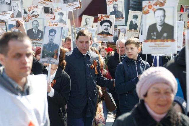 Затем по центру Екатеринбурга прошел "Бессмертный полк": по данным организаторов более ста тысяч свердловчан пронесли портреты своих отцов, дедов и прадедов, чтобы почтить память тех, кто не дожил до этого дня. Место в колонне по уже сложившейся традиции занял и Евгений Куйвашев с портретом своего деда – участника Великой Отечественной войны.