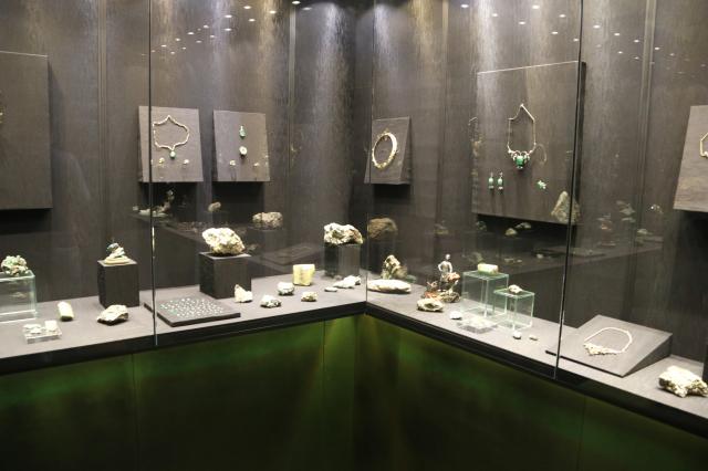 Группа украшений ведущих ювелирных фирм России подобрана для выставки таким образом, что демонстрирует использование самоцветных камней: демантоидов – "уральских изумрудов", халцедонов – "меккских камней", сердоликов. Аксессуары и портсигары также сочетают в себе драгоценные камни и металлы с самоцветами, как, например, портсигар австрийского психолога, психиатра и мыслителя Альфреда Адлера из серебра с опаловой гильоше-эмалью, но с боковыми панелями, вырезанными из нефрита. В Музее истории камнерезного и ювелирного искусства находится предмет этого мастера в футляре фирмы Карла Фаберже – единственный в российских государственных собраниях, поэтому соседство с ним портсигара представляет большой интерес.