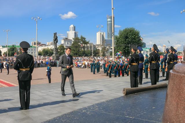 Возложение цветов к памятнику основателям города Василию Татищеву и Вильгельму де Геннину – еще одна добрая традиция, участником которой стал глава региона. Гостей церемонии встречал оркестр штаба Центрального военного округа и рота почетного караула. Евгений Куйвашев вместе с другими официальными лицами, почетными гражданами Екатеринбурга и даже гостями из-за рубежа – поздравить Екатеринбург приехала официальная делегация города-побратима Гуанчжоу – возложил к монументу красные гвоздики.