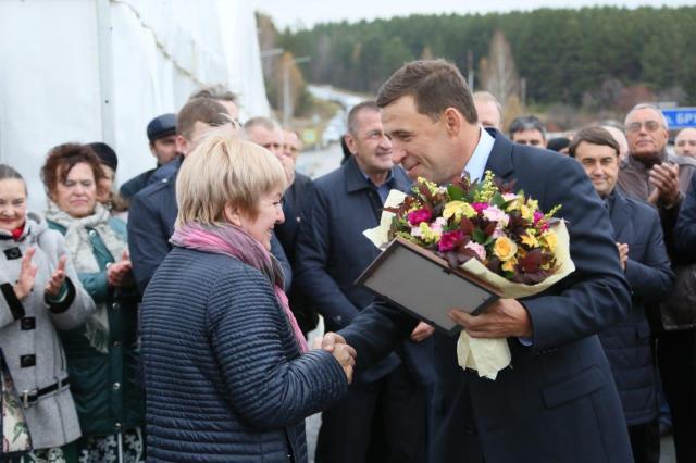 Глава Среднего Урала вручил награды участникам строительства. Генеральный директор компании-генподрядчика ООО "Жасмин" Александр Слесарев удостоен знака отличия "За заслуги перед Свердловской областью" III степени, сотрудники подрядной организации и областного управления автодорог получили из рук главы региона благодарственные письма.