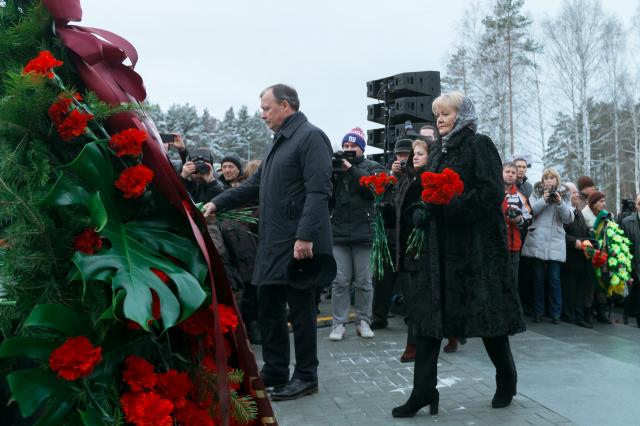 "Путь к сегодняшнему событию начался очень давно. Я знаю, сколько сил приложило руководство Свердловской области к тому, чтобы здесь появился монумент великого скульптора Эрнста Неизвестного. Но, может быть не все знают о том, что именно здесь, в Екатеринбурге, 1 февраля 2011 года Президентский Совет по правам человека представил главе государства проект концепции увековечивания памяти жертв политических репрессий. В этом году нам удалось реализовать три пункта этой программы: в сентябре в Подмосковье на Бутовском полигоне, где похоронено 20672 человека открылся Сад памяти, где на мраморных плитах запечатлены фамилии всех, кто был расстрелян на этом страшном месте. 30 октября в Москве на проспекте Академика Сахарова открылась Стена скорби. И вот сегодня третье историческое событие: мы открываем монумент "Маски скорби", – сказал советник Президента Российской Федерации, председатель Совета при Президенте РФ по развитию гражданского общества и правам человека Михаил Федотов.