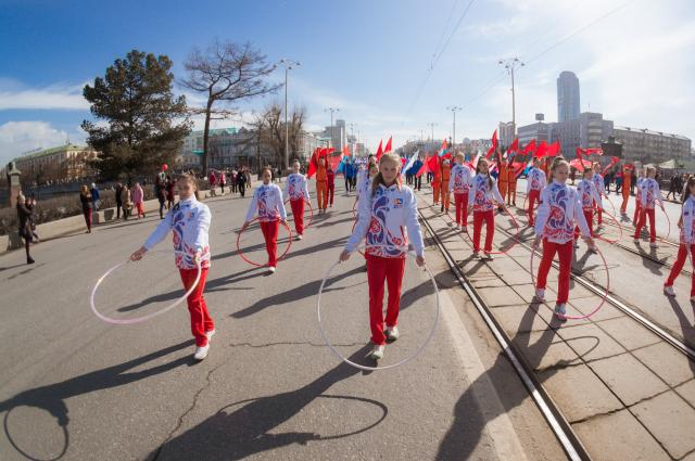 В этом году в составе праздничной колонны впервые за многие десятилетия прошла коробка спортсменов – это отсыл к традиции построения спортивных пирамид на первомайских демонстрациях 1920-1940-х годов, а также дань богатой истории профсоюзного движения на Урале и предстоящему Чемпионату мира по футболу.