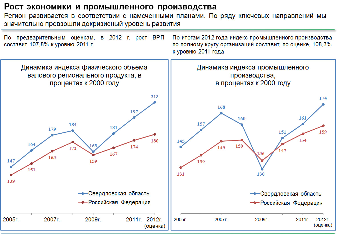 По итогам 2012 года Свердловская область по основным социально-экономическим показателям входит в первую десятку регионов Российской Федерации.