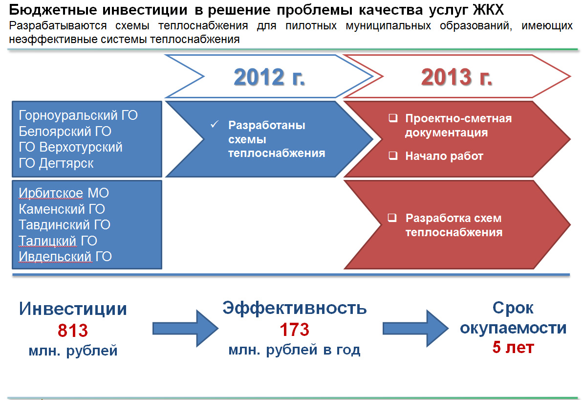 До конца этого года предложения будут направлены руководителям муниципалитетов. По 5 территориям: Ирбитское муниципальное образование, Каменский городской округ, Тавдинский городской округ, Талицкий городской округ, Ивдельский городской округ – в 2013 году будут разработаны и утверждены схемы теплоснабжения, выполнены проектно-изыскательские работы и разработана проектно-сметная документация по объектам, подлежащим реконструкции.