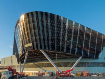 Как рассказал генеральный директор "Синара-Девелопмент" Тимур Уфимцев, строители продолжают работы по устройству медиафасада конгресс-центра. Применение LED-технологий позволят превратить поверхность здания в огромный экран из светодиодов, на котором предусмотрена возможность трансляции текстовых и графических изображений в высоком разрешении. Общая площадь медиафасада составит 2970 кв. м. Современные покрытия обеспечат высокую степень защиты от солнечного излучения, а также поддержат комфортный микроклимат внутри здания.