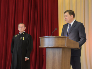 "Ваш судейский стаж составляет 36 лет. За это время вы прошли славный путь от судьи до председателя Свердловского областного суда. Ваш преемник — Владимир Андреевич Дмитриев — принимает крепкую, профессиональную, эффективно работающую структуру. И это, конечно, во многом ваша заслуга. Вы пользуетесь высоким авторитетом в профессиональном сообществе, заслужили признание и уважение коллег", — сказал губернатор, обращаясь к уходящему в почетную отставку председателю облсуда.