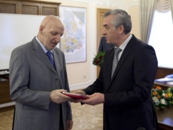 "С удовольствием выполняю эту почетную миссию, знаю Вашу биографию — Вы действительно заслужили эту награду и спасибо за Ваши труды", — отметил Яков Силин, пожелав Алексану Карапетяну здоровья.