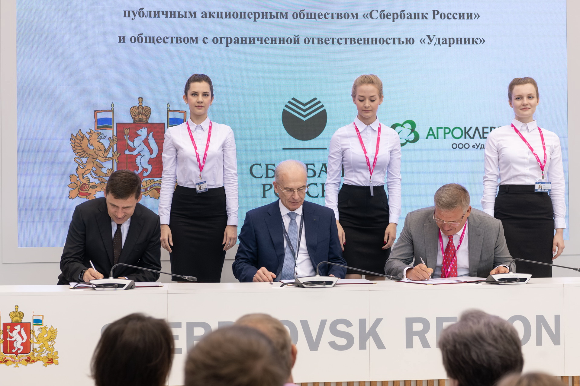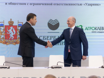 Правительство Свердловской области, Уральский банк Сбербанка и ООО "Ударник" 10 июля на полях ИННОПРОМа заключили соглашение о реализации инвестиционного проекта по строительству молочно-товарной фермы. Документ был подписан губернатором Свердловской области Евгением Куйвашевым, председателем Уральского банка Сбербанка Владимиром Черкашиным и учредителем ООО "Ударник" Алексеем Бобровым.