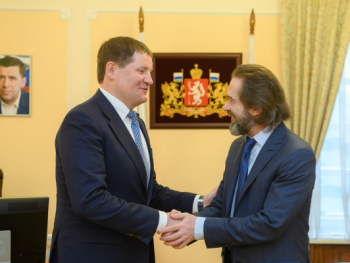 Вице-губернатор Свердловской области Сергей Бидонько и художественный руководитель Московского театра Олега Табакова, народный артист России Владимир Машков 4 февраля в ходе рабочей встречи обсудили вопросы, связанные с процессом внесения изменений в Конституцию РФ.