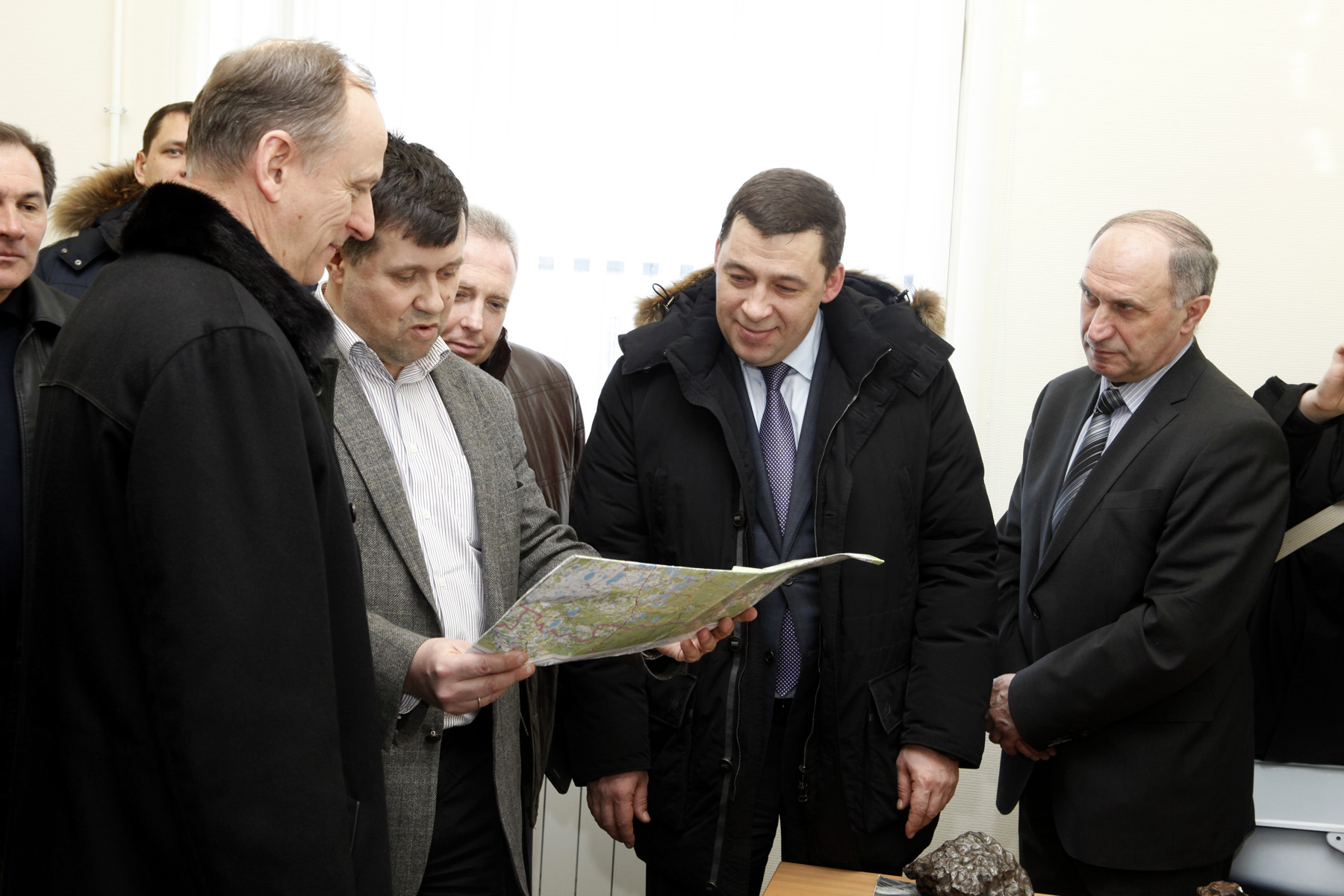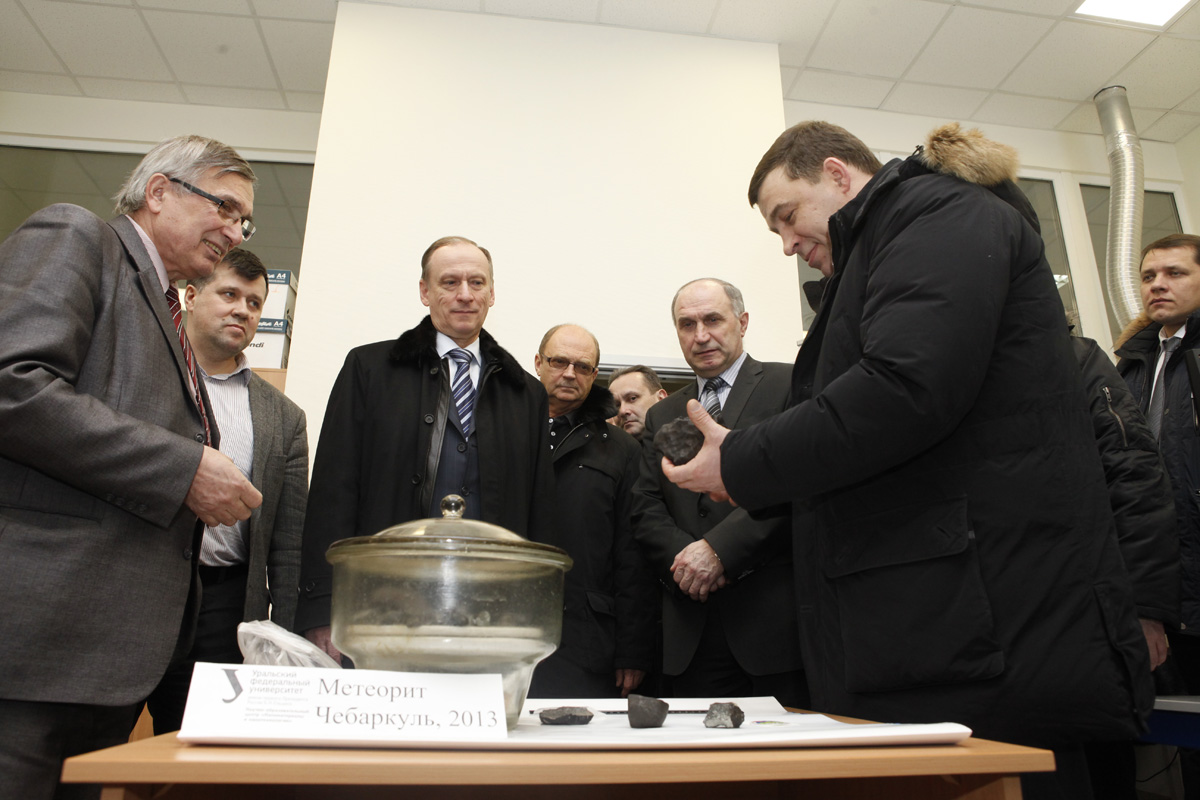 Секретарь Совета Безопасности РФ Николай Патрушев и губернатор Евгений Куйвашев 26 февраля посетили наноцентр Уральского федерального университета, где ученые продемонстрировали им осколки метеорита, упавшего на Южном Урале.