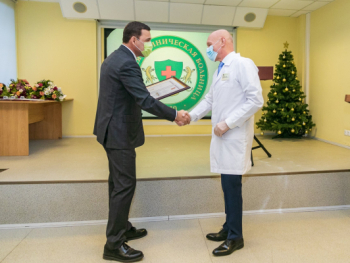 В числе награждённых – главный врач больницы Александр Прудков. Получая благодарственное письмо Президента РФ, он поблагодарил за поддержку, оказанную медицинскому сообществу в 2020 году.