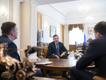Губернатор Евгений Куйвашев и директор Информационного центра Организации Объединённых Наций в Москве Владимир Кузнецов на рабочей встрече 20 апреля обсудили идею проведения в Свердловской области мероприятия, которое объединило бы две важнейшие для ООН темы – экологии и развития спорта.