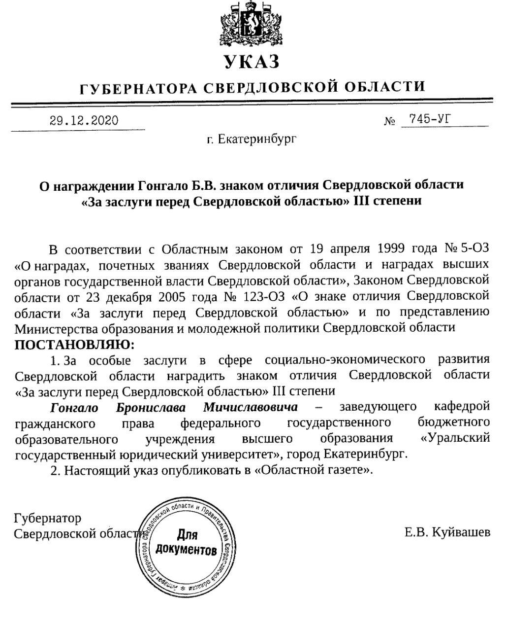 О награждении Гонгало Б.В. знаком отличия Свердловской области "За заслуги перед Свердловской областью" III степени