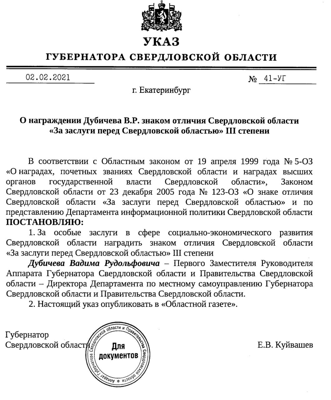 О награждении Дубичева В.Р. знаком отличия Свердловской области "За заслуги перед Свердловской областью" III степени