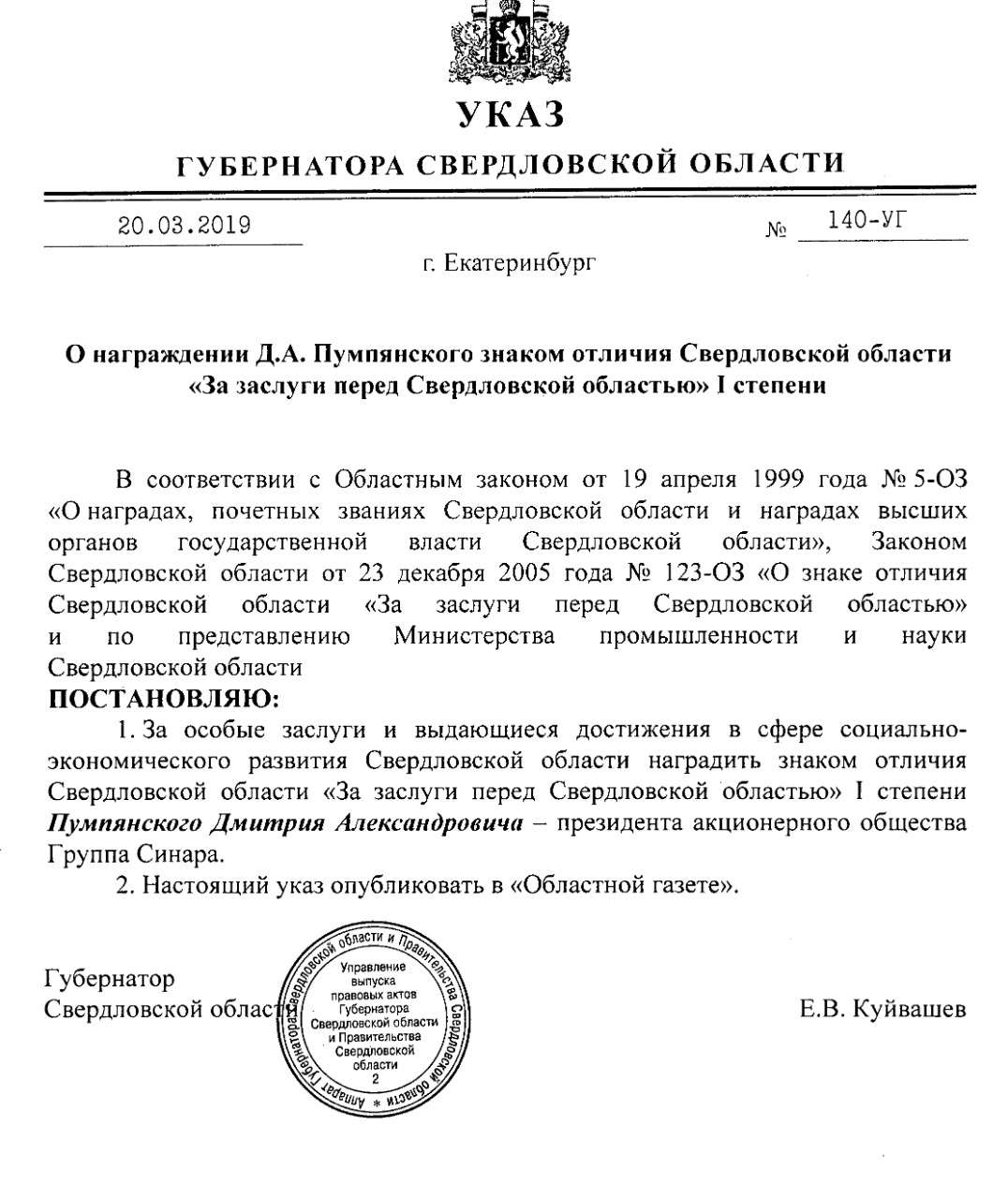 О награждении Д.А.Пумпянского знаком отличия Свердловской области "За заслуги перед Свердловской областью" I степени