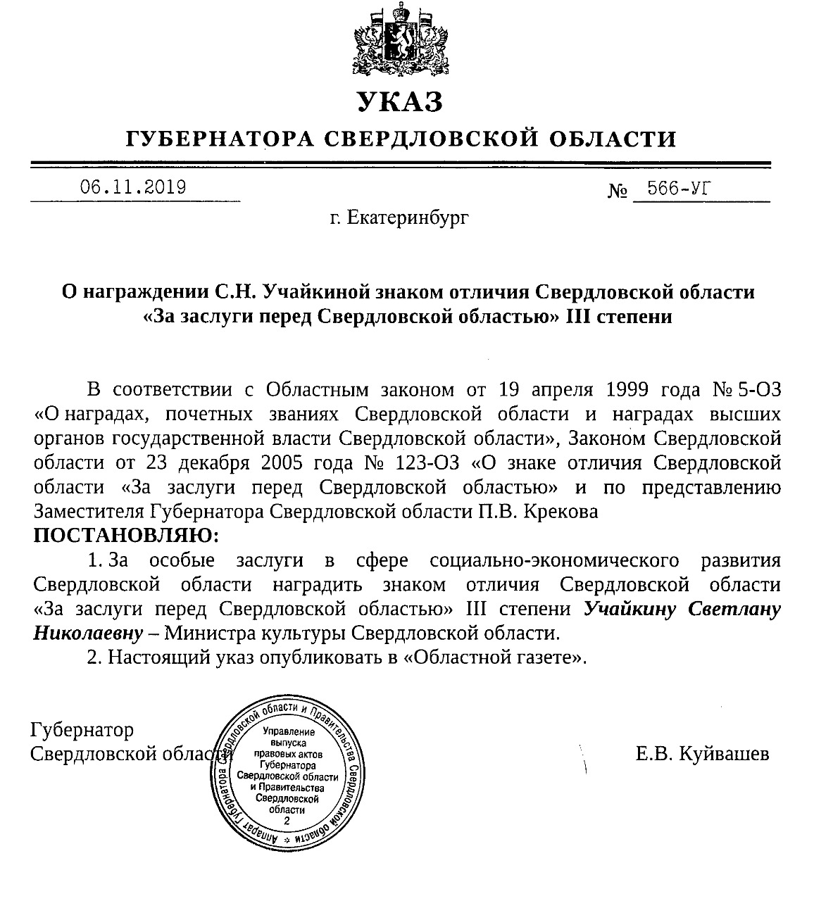 О награждении С.Н. Учайкиной знаком отличия Свердловской области "За заслуги перед Свердловской областью" III степени