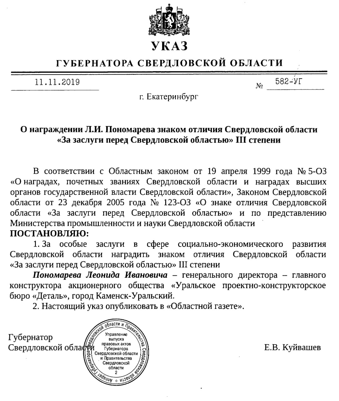 О награждении Л.И. Пономарева знаком отличия Свердловской области "За заслуги перед Свердловской областью" III степени