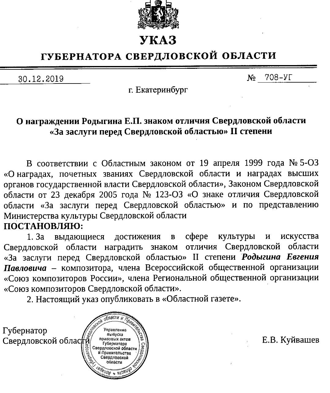 О награждении Родыгина Е.П. знаком отличия Свердловской области "За заслуги перед Свердловской областью" II степени