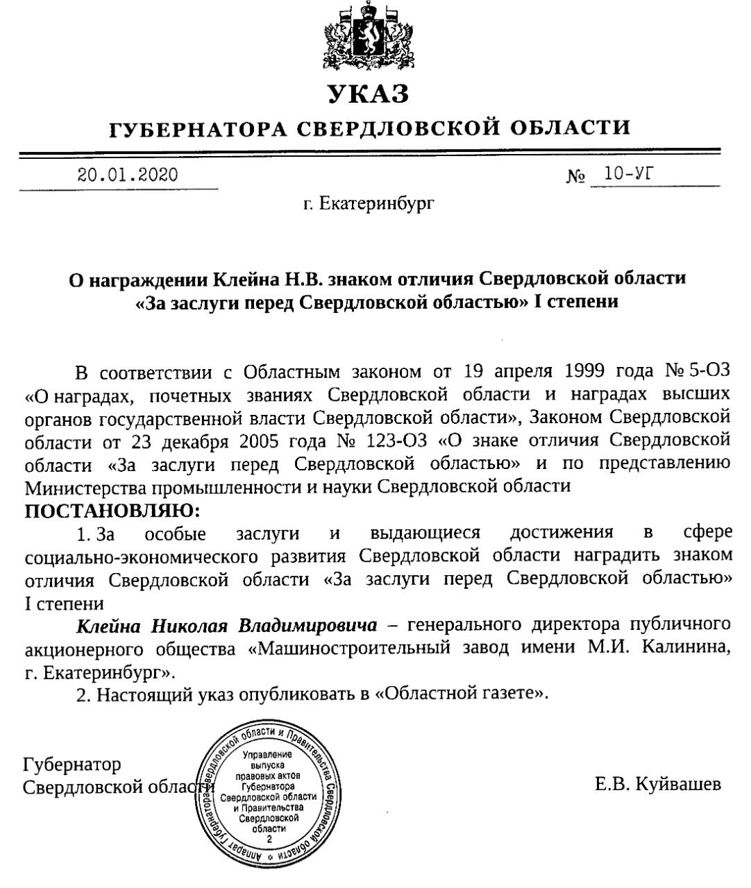 О награждении Клейна Н.В. знаком отличия Свердловской области "За заслуги перед Свердловской областью" I степени