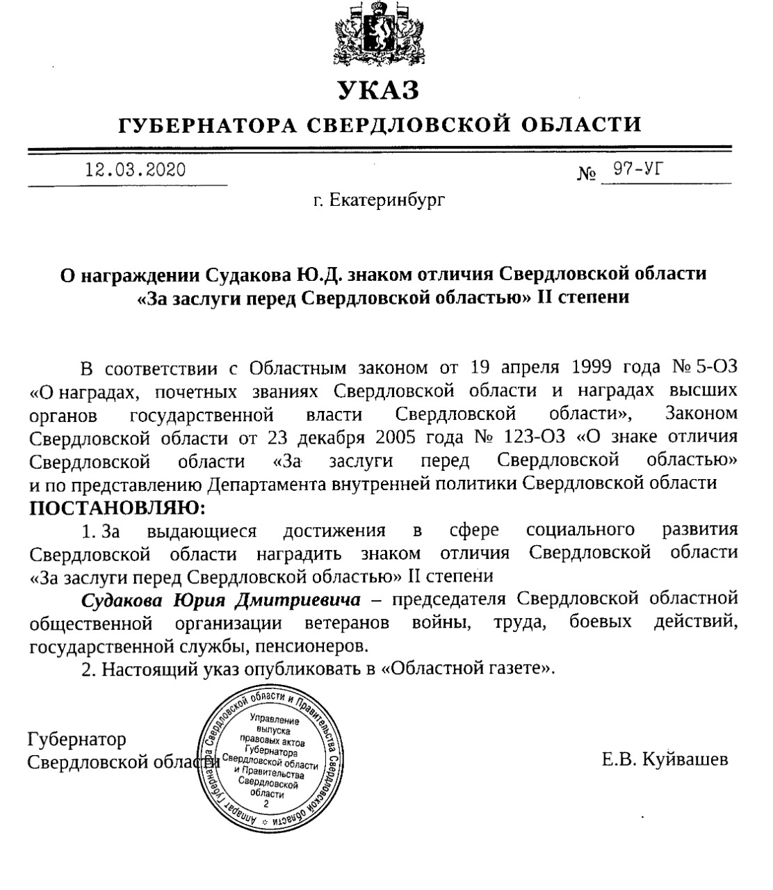 О награждении Судакова Ю.Д. знаком отличия Свердловской области "За заслуги перед Свердловской областью" II степени