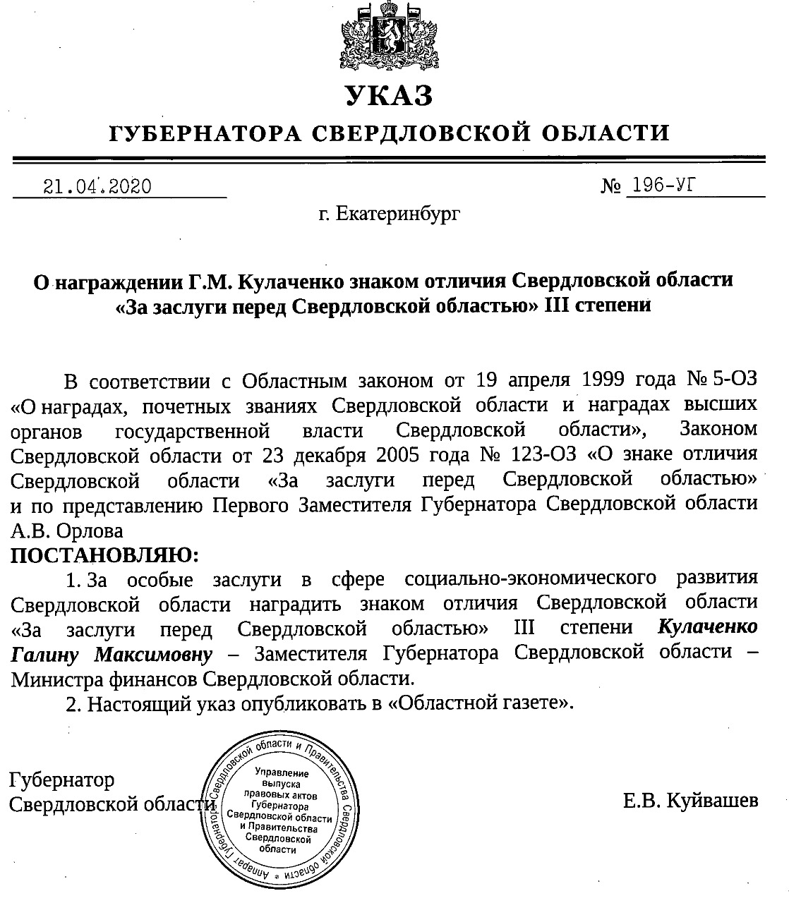 О награждении Г.М. Кулаченко знаком отличия Свердловской области "За заслуги перед Свердловской областью" III степени