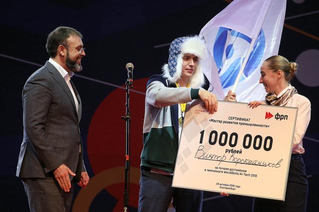 По традиции, сертификат номиналом 1 миллион рублей от фонда развития промышленности получил участник соревнований, набравший максимальное количество баллов. Им стал представитель ГК "Росатом" Виктор Коробейников.
